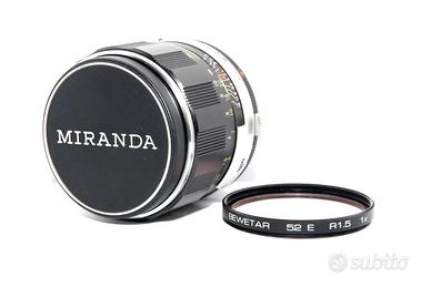 AUTO MIRANDA E 50mm f.1,4 Luminoso Obiettivo Standard Originale Miranda ***Funzionante e in Eccellenti Condizioni*** Dedicato alle Reflex Miranda Sensomat, Sensorex, ecc. Predisposto per Modelli con Lettura a Tutta Apertura (es. DX-3, RE-II, EE-2) *Utilizzabile anche su vari modelli di fotocamere digitali CON APPOSITO ADATTATORE* OGGETTI COMPRESI OBIETTIVO AUTO MIRANDA E 50mm 1.4 TAPPI ANTERIORE E POSTERIORE ORIGINALI FILTRO SKYLIGHT BEWETAR R1.5 1x diametro 52mm STATO DEGLI OGGETTI OBIETTIVO IN CONDIZIONI ECCELLENTI E FUNZIONANTE. DIAFRAMMA PULITO. GHIERA FLUIDA. SENZA GRAFFI E/O FUNGHI SULLE LENTI. SEGNI D'USO PRATICAMENTE ASSENTI. TAPPI ORIGINALI. DESCRIZIONE L’obiettivo MIRANDA E 50mm 1.4, è un classico obiettivo standard in versione con massima apertura F.1,4. Dotato di costruzione solida, è un obiettivo luminoso, ottimo per tutte le situazioni fotografiche e di grande qualità. Produce immagini con ottimi contrasto e dettaglio. Innesto con Baionetta Miranda. Può essere utilizzato su moderne fotocamere digitali con l'ausilio di appositi adattatori. *** IN VENDITA ALTRI ARTICOLI FOTOGRAFICI, GUARDA I MIEI ANNUNCI ***