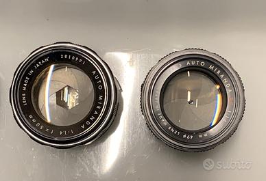 Diverse ottiche Miranda tra le quali tre diverse esecuzioni dell'ottimo 50mm 1,4, un grandangolare 28mm 2,8 poi una ottica stile Exakta con levetta di scatto sull'ottica e inoltre un obiettivo tra i primi della Miranda che ha ancora innesto a vite M44 (non M42 Pentax) che le reflex anche piú moderne hanno mantenuto assime al innesto a baionetta con collare di serraggio tipico Miranda. Per il 50mm ultima versione e per il 28mm chiedo 50€ cadauno. Un’altro 50mm otticamente ottimo ma con una ghiera esteticamente non perfetta chiedo 40€. Per quello a vite molto vintage 30€. Per l'ottica con la leva stile Exakta che é priva di diaframma chiedo 20 Euro. Se mi dite quale interessa le mando foto dettagliate.