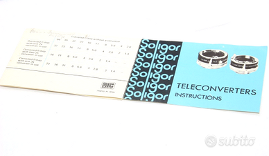 SOLIGOR AUTO TELE CONVERTER 2X TO FIT MIRANDA Moltiplicatore - Duplicatore di Focale Innesto Baionetta Miranda DEDICATO AGLI OBIETTIVI E ALLE REFLEX CON BAIONETTA MIRANDA (SENSOMAT, SENSOREX, ECC.) OGGETTI COMPRESI SOLIGOR AUTO TELE CONVERTER 2X per MIRANDA FOGLIO ISTRUZIONI (ENG.) N.B. la fotocamera e l'obiettivo in foto NON sono inclusi STATO DEGLI OGGETTI DUPLICATORE IN CONDIZIONI OTTIME E FUNZIONANTE. SENZA GRAFFI E/O FUNGHI SULLE LENTI E SUL BARILOTTO. SEGNI D’USO ASSOLUTAMENTE IRRILEVANTI. DESCRIZIONE DUPLICATORE: CONSENTE DI RADDOPPIARE LA FOCALE DELL'OBIETTIVO CON CUI E' USATO. SI INNESTA TRA IL CORPO DELLA FOTOCAMERA E L'OBIETTIVO E PERMETTE DI RADDOPPIARE IL NUMERO DELLE FOCALI A DISPOSIZIONE (UN 50mm DIVENTA UN 100mm, ECC.). COMPATIBILI CON INNESTO MIRANDA. CON QUESTO ACCESSORIO AUMENTANO LE POSSIBILITA' DI RIPRESA SENZA UN ELEVATO E INGOMBRANTE NUMERO DI OBIETTIVI. *** GUARDA I MIEI ALTRI ANNUNCI DI MATERIALE FOTOGRAFICO ***