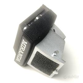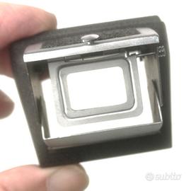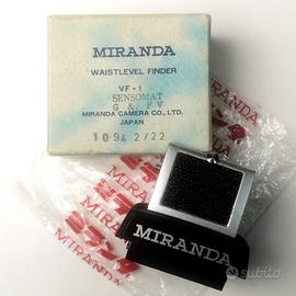 Mirino a pozzetto Miranda Waistlevel Finder VF-1, un accessorio vintage progettato per le fotocamere reflex 35mm prodotte dalla Miranda Camera Co. in Giappone. Progettato per i modelli Miranda Sensomat G e FV. Permette di guardare dall'alto verso il basso per inquadrare il soggetto, ideale per scatti a livello della vita. Sostituisce il pentaprisma standard sulla parte superiore della fotocamera, permettendo di inquadrare guardando dall'alto.
