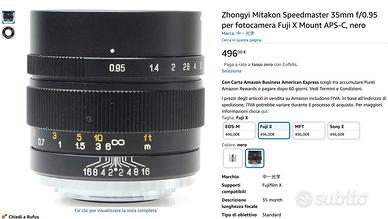 Zhongyi Mitakon Speedmaster 35mm f/0.95 per Fuji X In condizioni pari al nuovo, lenti pulite senza segni, ghiere fluidissime. Divertimento assicurato con incredibili sfuocati a 0.95 Vendo perchè ho troppe lenti per Fuji e devo ridurre un pò. Qualunque prova se viene ritirato a mano, oppure spedizione. Non è presente la scatola ma sarà imballato con la massima cura. Guardate le mie recensioni per garanzia.