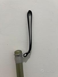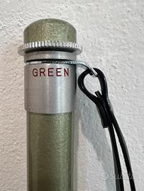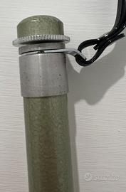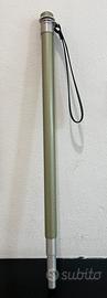 monopiede telescopico vintage o un'asta estensibile con caratteristiche simili a quelle dei supporti fotografici d'epoca. La finitura in alluminio spazzolato, il colore verde metallizzato e il meccanismo a sezioni sono elementi tipici di accessori prodotti tra gli anni '60 e '70