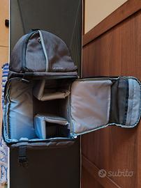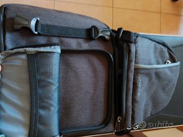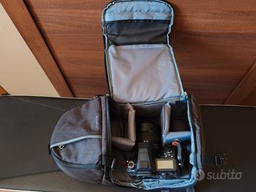 Monospalla fotografico mai usato, per una reflex con obiettivo più due altri obiettivi. Ulteriore scomparto per compatta o obiettivo, vari scomparti per accessori. Divisori come da foto. Veramente perfetto.