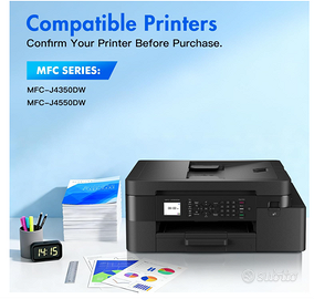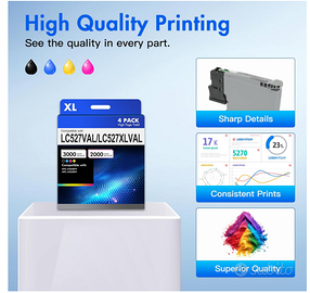 Multipack Cartucce LC527XL per Brother MFC-J4350DW / J4550DW – XXL Vendo set completo di cartucce d'inchiostro INFITONER LC527XL (Multipack 4 colori), compatibili con stampanti Brother. Sono la versione XL ad alta capacità, ideali per chi stampa molto e vuole risparmiare senza rinunciare alla qualità. Il set è nuovo, sigillato e pronto all'uso. 📦 Contenuto del Set (4 Cartucce): 1x Nero LC527XL (Resa: circa 3000 pagine) 1x Ciano LC527XL (Resa: circa 2000 pagine) 1x Magenta LC527XL (Resa: circa 2000 pagine) 1x Giallo LC527XL (Resa: circa 2000 pagine) ✅ Stampanti Compatibili: Queste cartucce sono specifiche per i seguenti modelli Brother MFC: MFC-J4350DW MFC-J4550DW (Serie 4350 / 4550) ✨ Perché sceglierle: Risparmio netto: Molto più convenienti delle originali con la stessa resa cromatica. Alta Capacità (XL): Stampano molte più pagine rispetto alle cartucce standard. Affidabilità: Colori vivaci, testi nitidi e stampa fluida senza sbavature. Facile installazione: Riconoscimento immediato dalla stampante. ✅ Spedizione rapida ✅ Imballaggio sicuro per evitare perdite Nota: Sono cartucce compatibili di alta qualità, non originali Brother.