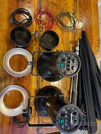 N.2 Fotocellule di sincronizzazione. Cavo sincroflash e cavi di alimentazione. Valigia di trasporto vintage in omaggio insieme a ombrelli e cavalletti