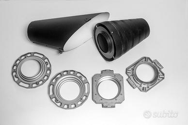 n. 4 monotorcia Hensel perfettamente funzionanti tenuti in maniera maniacale + acessori parabole griglie tubi spot e snot + anelli adattatori per diffusori + 2 diffusori Lastolite