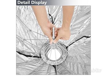 Caratteristiche: ombrello pieghevole softbox, facile e veloce da aprire o riporre; tessuto resistente al calore e ventilazione sigillabile per fonti di illuminazione ad alta potenza e continua
