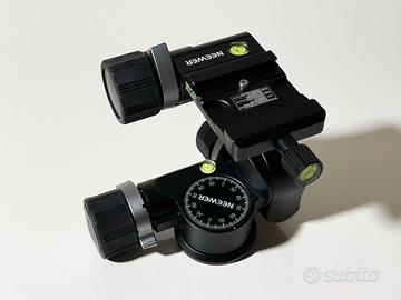Testa Cavalletto a 3 Assi Panoramica e Inclinabile con Colonna Centrale Corta. La testa a 3 vie con ingranaggi NEEWER TH15 garantisce un posizionamento flessibile della fotocamera con inclinazione frontale di -45°~90°, inclinazione laterale di -90°~90° e panoramica a 360°. Due livelle a bolla ti aiutano con un livellamento accurato e mantengono sempre la fotocamera dritta. Include anche una colonna centrale corta da φ25 x 50mm per un sollevamento efficiente e una maggiore versatilità di ripresa