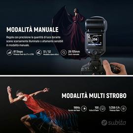 【UI Migliorata e Cambio Rapido TTL/M】Il flash Z2-C NEEWER presenta ora una UI migliorata e cambio da modalità TTL a M tramite il tasto TCM in un secondo. Offre metering automatico o dimmerazione manuale da 1/1 a 1/256 e si adatta a lunghezze focali di 28mm-105mm.Supporta inoltre la modalità Multi Strobe,la sincronizzazione ad alta velocità da 1/8000s,sincronizzazione a tendina anteriore/posteriore,FEC/FEB (compensazione/bracketing dell'esposizione del flash),modalità slave ottica S1/S2,ecc.