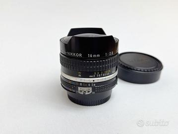 Vendo obiettivo NIKKOR 16mm f/2.8 Fisheye, un obiettivo leggendario che offre un angolo di visione ultra-wide di 180° e un effetto fisheye unico, perfetto per paesaggi, architettura e scatti creativi.