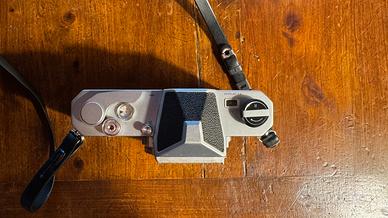 Segnalo che l’avvolgi pellicola non è quello di questa macchina ma è un pezzo sostitutivo preso da una pentax spotmatic. Inoltre manca l’anello nel mirino ma non influisce sull’uso della macchina. La pelle originale è stata sostituita con del neoprene che puo essere facilmente rimosso se volete stilizzarla in modo differente.