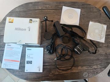 Macchina fotografia Nikon 1, con obiettivo zoom Nikkor 10-30 mm. f: 1:3,5-5,6, caricabatterie, scheda, piccolo treppiede, manuale d'uso e manuale rapido, programmi su dvd, cavi di collegamento, cavo di alimentazione, tappi per obiettivo e corpo macchina. In un'ottica di massima trasparenza dichiaro che manca il tappo copri obiettivo e che si è rotto il pezzettino di plastica interno che tiene in posizione la batteria. Ho risolto il problema artigianalmente con un piccolo spessore di carta e quindi la macchina funziona regolarmente.