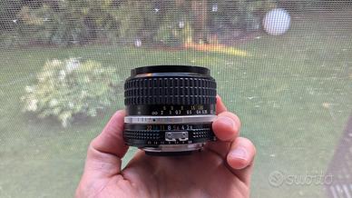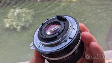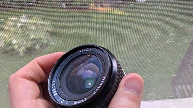 Vendo obiettivo grandangolare Nikon Nikkor 24mm f/2.8 Ai-s. L'obiettivo è in buono stato estetico e meccanico. Gli elementi ottici sono privi di graffi o muffa. È presente una piccola ammaccatura sull'attacco per i filtri visibile nella seconda foto. Tuttavia, i filtri ottici si montano senza problemi.
