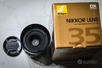 Vendo obiettivo NIKON AF-S DX 35mm f/1.8 G usato con qualche piccolo segno di usura da normale utilizzo, completo di scatola, libretto d'istruzioni, paraluce e tappi copri obbiettivo anteriore e posteriore.