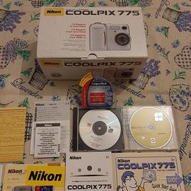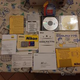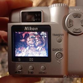 Fotocamera digitale con tutti i libretti istruzione su carta e CD, batteria originale ( ancora funzionante 50 % circa ) , carica batteria, 2 schede memoria Compact Flash da 8 e 32 MB, cavetti video e USB per collegamento a TV e PC, custodia e scatola, tutto originale Nikon a parte scheda CF 32 MB.