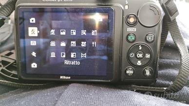 fotocamera mirror con ottica Nikkor con zoom 15x, diaframma 3,5- 5,4. diverse possibilità di foto automatica, interni,esterni, paesaggi, sport, ritratto intelligente con azionamento automatico a sorriso, panoramica, notturno, contro sole, autoscatto, possibilità di filmare.