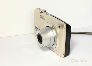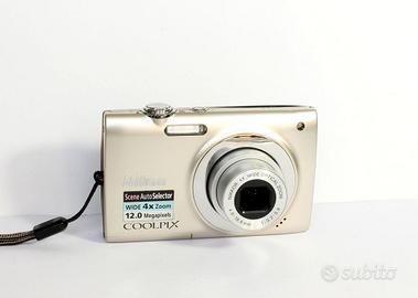Fotocamera digitale Nikon Coolpix S2500, funzionante e testata. Prezzo non negoziabile. Le condizioni estetiche sono come da foto, tenuta benissimo, minimi segni di un normale utilizzo, il colore è champagne. Corpo in metallo ultrasottile, sensore da 12 MP, zoom ottico 4x, grandangolo, monitor LCD da 2,7 pollici, registra video, sistema antivibrazioni per evitare foto mosse, 5 modalità di utilizzare il flash, ritratto intelligente, scatta foto anche in bianco e nero e seppiate con effetto vintage e molte altre funzioni. Vendo la fotocamera con il laccetto da polso, la batteria, il cavo USB per caricare la batteria tramite computer e trasferire le foto, la scheda di memoria SD da 4 GB, regalo custodia per un comodo trasporto, il tutto come da foto. Non sono inclusi altri accessori. Solo ritiro a mano.