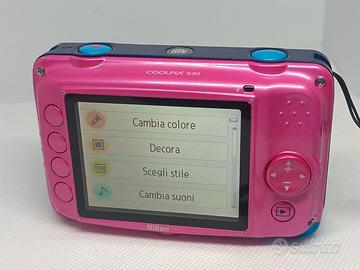 Fotocamera Nikon Coolpix S30 rosa e blu In buone condizioni. Funzionante con due pile ricaricabili da 1.5V (non incluse), il funzionamento con pile differenti non adeguate non è garantito. Flash funzionante. Si riceve ciò che è in foto. Non assicuro il funzionamento della fotocamera sott'acqua poiché avendo tanti anni potrebbe aver perso l'impermeabilità. Disponibili foto di esempio. NO GARANZIA, NO RESI.