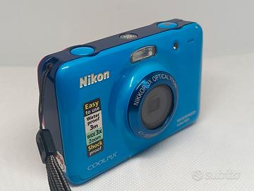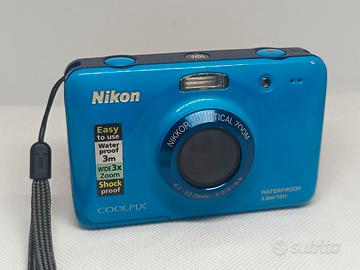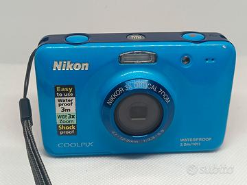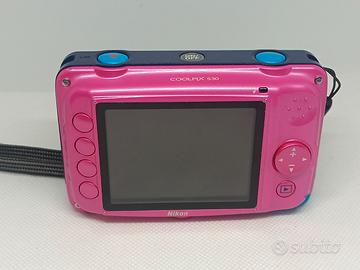 Fotocamera Nikon Coolpix S30 rosa e blu In buone condizioni. Funzionante con due pile ricaricabili da 1.5V (non incluse), il funzionamento con pile differenti non adeguate non è garantito. Flash funzionante. Si riceve ciò che è in foto. Non assicuro il funzionamento della fotocamera sott'acqua poiché avendo tanti anni potrebbe aver perso l'impermeabilità. Disponibili foto di esempio. NO GARANZIA, NO RESI.