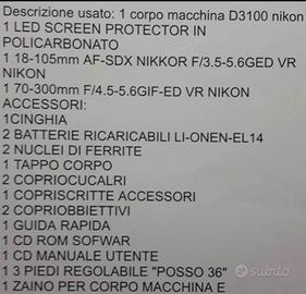 Vendo come da titolo Nikon D3100 con tutta l'attrezzatura come da foto e lista.. Non affaristi e non vendita singolo articolo.. Completamente nuova usata pochissimo... Vendo per mancato utilizzo..
