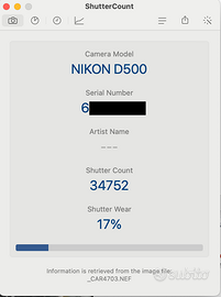 Vendo splendida Nikon D500 sensore APS-C da 21Mpixel, utilizzata come secondo corpo, la vendo per inutilizzo. Scatti all'attivo --34.700--!! Completa di confezione originale e tutti gli accessori: cinghia Nikon, batteria e carica batterie, cavi.