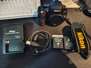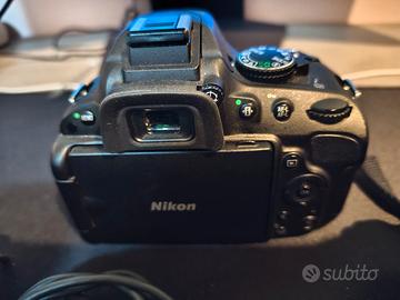 Nikon d5100 , pochi scatti 7800 , corredata di ciò che è in foto , display presenta due righe orizzontali ma che non compromettono il suo funzionamento o utilizzo.