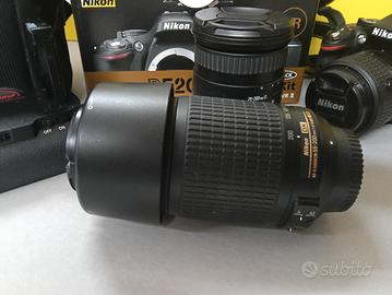 Nikon teleobiettivo 55-200 G ED VR, con paraluce e tappi.