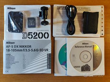 Fotocamera digitale Nikon D5200 dotata di obbiettivo Nikkor 18-105mm f/3.5-5.6G ED VR usata poco (solo 1172 scatti), perfettamente funzionante e in ottime condizioni. Assieme agli accessori originali (cavi/caricabatteria/manuali) spedisco anche i seguenti accessori aggiuntivi: telecomando infrarossi Nikon ML-L3, secondo caricabatteria, SD Card da 16GB, SD Card da 8GB, Kit Pulizia e zaino anch'esso in ottime condizioni.