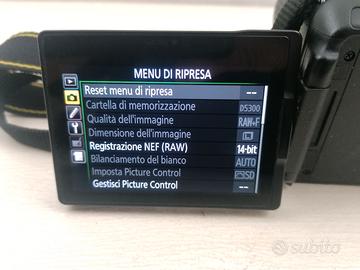 Reflex Nikon d5300 Video FULL HD Wi-Fi Perfettamente funzionante, upgrade con obiettivo 70mm a diaframma maggiore rispetto al 18-55 standart. Incluso: Reflex Corpo macchina Obiettivo AF-S DX NIKKOR 18-70mm f/3.5-5.6G VR (autofocus e stabilizzatore) Caricabatteria Batteria Filtro protettivo Tracolla Cavo USB Con Wi-Fi e GPS incorporati, questa eccezionale fotocamera da 24,2 megapixel in formato DX consente di catturare e condividere la magia del mondo in modo incredibilmente dettagliato. La funzione Wi-Fi consente di collegare la fotocamera direttamente a uno smart device e di condividere le foto immediatamente dopo averle scattate. La funzione GPS aggiunge alle foto le informazioni sulla posizione, semplificando l'aggiunta di immagini alle mappe, e la condivisione con gli altri. Il GPS consente di aggiungere alle immagini informazioni precise sulla posizione in cui sono state scattate ed è perfetto per condividere con gli amici le foto di viaggio. Foto più intriganti e filmati più divertenti. Il versatile monitor orientabile consente di scattare foto da prospettive uniche e originali. Filmati Full HD fluidi ed estremamente dettagliati di cui essere orgogliosi (a frequenze fotogrammi fino a 50p/60p). L'autofocus Live View continuo mantiene nitidi i soggetti, anche quando l'azione è veloce. Possibile spedizione tracciabile con corriere espresso e pagamento anche via PayPal È escluso tutto quanto non espressamente indicato in annuncio o non visibile in foto