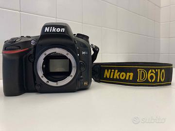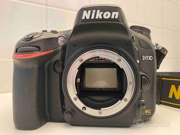 La D610 ha 13.011 scatti, usata frequentemente ma per pochi scatti, soprattutto panorami e ritratti. Fornisco anche scatola, batteria, cavi e caricabatterie, tutti originali.