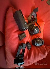 La macchina in questione APSC è corredata di manuale di istruzioni tracolla , due obbiettivi ( AF-S Nikon DX 35mm 1:8 - Nikon DX 18-105 3:5 ) due batterie un impugnatura aggiuntiva con alloggiamento batteria supplementare.