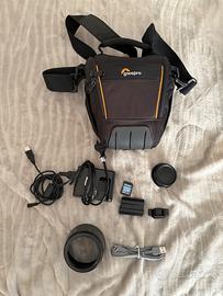 Inclusa dei seguenti accessori: batteria + caricatore, para luce, SD 32 GB (la réflex ha possibilità di utilizzo doppia SD poiché provvista di 2 porte), aggancio per flash, adattarore per treppiede (rimovibile), 2 cavi per collegamento a computer + libretto istruzioni originale.