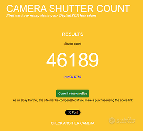 Vendo per inutilizzo Reflex Nikon D750 Qualche segno di usura, ma perfettamente funzionante. Numero di scatti: 46189 Nella vendita sono comprese: - batteria e caricabatteria originale Nikon - n°4 batterie compatibili - scatola con cinghia e tappo originali - cavetto per controllo da smartphone - scheda Sandisk Extreme Pro da 64 GB 95 MB/s - Obiettivo AF-S Nikkor AF-S 28-300mm f/3.5-5.6 G ED VR