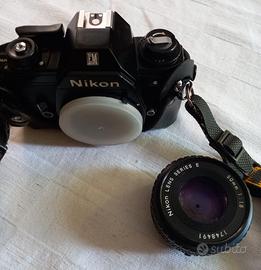 Nikon EM+Ob. Nikon Serie E 50mm 1.8, con custodia in pelle, a pellicola. La fotocamera funziona ma non funziona l'esposimetro e va revisionata. Scatta comunque. Non vendo separati.