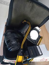 kit completo: corpo macchina Nikon F 401 S, obiettivo Sigma Nikon 35-135, flash e borsa.