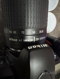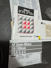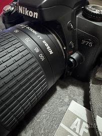 Kit completo fotocamera analogica F75, fotocamera prodotta a partire dal 2003, naturale successore della F70. Il Kit comprende la fotocamera, perfettamente funzionante e testata, obbiettivo zoom AF autofocus 28-100, borsa fotografica originale Nikon, tracolla Nikon, tappi di camera e lente e manuali di istruzioni.