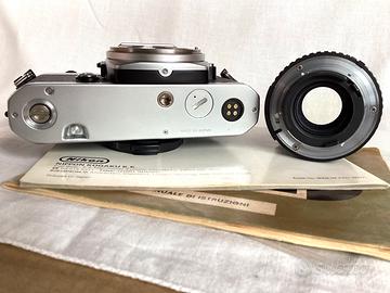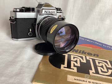 Fotocamera analogica Nikon FE cromo in eccellenti condizioni funzionali ed estetiche.Obiettivo Nikon serie E 135/2,8 AIS.Scatto,
