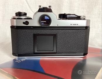 esposimetro,mirino pulito,lenti limpide prive di difetti,diaframma scattante,messa a fuoco fluida,paraluce incorporato,tappo,libretti,