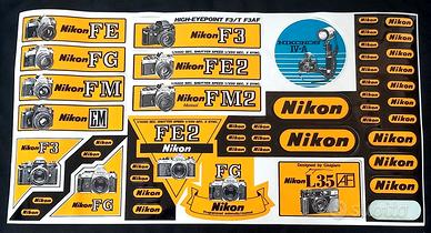 Libretti istruzioni per NIKON FE, FM, FM2 con due scatole per corpi NIKON FM e FM2 con custodie in polistirolo originali, e un foglio di adesivi Nikon anni '90.