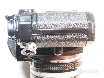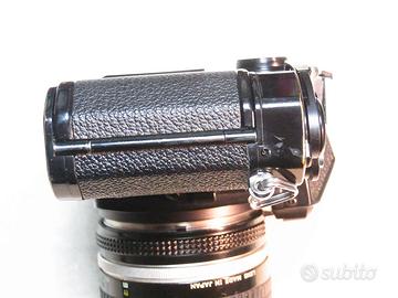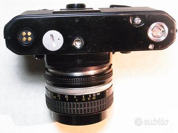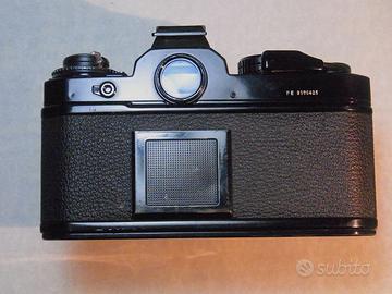 Nikon fe nera con obiettivo 50 1,4. Fotocamera in buone condizioni estetiche con diversi segni d'uso, ma essendo nera mostra esattamente il suo stato. Il pentaprisma ha una piccola ammaccatura. Completamente funzionante, meccanica ok, mirino ok, esposimetro ok, guarnizione del dorso ok. L'obiettivo ha lenti pulite senza graffi o muffe, diaframma ok. La ghiera del fuoco e un po' lenta a causa dell'eta'. Completa di cinturino non originale.