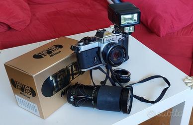 Macchina fotografica Nikon FE 35 mm più obiettivi (50 mm + zoom 28- 210), filtri, flash e duplicatore di focale.