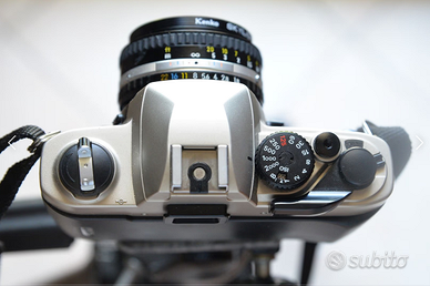 Fotocamera meccanica Nikon FM 10, prima serie con calotta e fondello in alluminio e non in policarbonato.