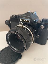 Nikon FM versione black FUNZIONANTE testata con rillino di recente perfetta!!! Qualche piccolo segno di normale utilizzo ma senza botte o ammaccature, ripeto solo qualche segno!! Logicamente l’esposimetro funziona correttamente, batteria ancora utilizzabile per molto tempo, questa macchina è totalmente meccanica e funziona anche senza batterie!!! Ottica Nikon 50mm AI manual focus perfetta sis sotto l’aspetto estetico che funzionale.