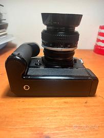 Nikon FM con motore MD 11 e obiettivo Nikkor AI 55 mm f 1.2 luminosissimo.