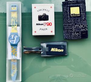 Orologio tipo Swatch azzurro giallo con logo Nikon.