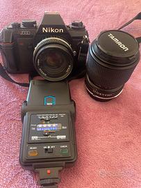 Nikon N2000 fotocamera a pellicola macchina fotografica reflex analogica. Perfettamente funzionante, con flashCrown 174 MD, obiettivo TAMRON 70-210mm F4. Usata pochissimo. Filtro optical pro master Completa di Borsa , no perditempo