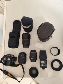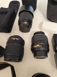 Nikon d3200, obiettivo 18/105 nikon, obiettivo 70/300 tamron, obiettivo 18 /55, nikon, obiettivo macro, flash sb 600 nikon, + 2 filtri, 3 paraluce, borsa, e box porta obiettivi 3batterie nuove. Tutto perfettamente funzionante, qualsiasi prova, sul posto,pochissimi scatti, vendo per inutilizzo.