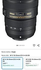 Nikon Nikkor AF-S 18-35 Vendo fantastico obiettivo per full frame ultra grandangolare Nikon Nikkor AF-S 18-35 mm f3.5-4.5 G ED. Introvabile seconda mano in quanto chi lo ha se lo tiene per bene. GUARDATE SU JUZAPHOTO LE FOTO CHE TIRA FUORI QUESTA LENTE. L'obiettivo è nuovo, aperta la scatola per fare le foto dell'annuncio e rimesso al suo posto. Ideale per fotografie di paesaggio e street photography. Fatto personalmente dei test accanto al 16-35 f4 e il 18-35 risulta molto più nitido ai bordi rispetto al primo che costa e pesa il doppio. Quindi chi sta cercando un grandangolo senza vendere un rene questo è il giusto compromesso. Sacca morbida per il trasporto scatola e paraluce, tutto originale Nikon. Visto che la lente è in perfette condizioni il prezzo non è trattabile, oppure cercate quello "stanco" a 350 EUR con le ghiere usurate e pieno di polveri. Disponibile a inviare altre foto. Consegna a mano in zona Lodi-Piacenza oppure spedizione con Tuttosubito entro 24h con imballo a prova di corriere. 18-35 16-35 18/35mm 3.5-4.5 3.5-4.5G