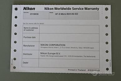 Nikon Nikkor 60mm f 2.8 AF-S ED G Micro Seriale 2316836 Comprende tappo posteriore e anteriore, paraluce originale, sacca, scatola originale, garanzia in bianco, manuale Il barilotto è in condizioni perfette, senza graffi o mancanze di colore Le lenti sono perfette, senza polvere, funghi o graffi Le lamelle sono pulite, senza tracce di olio e ritornano perfettamente La messa a fuoco è silenziosa, precisa e fluida L'anello delle aperture è preciso e fluido