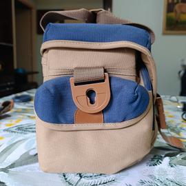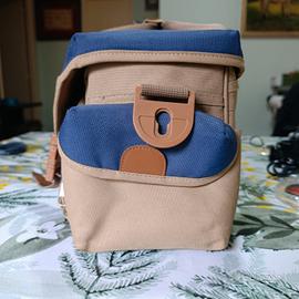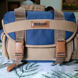 Tracolla per fotocamera Nikon. - Colore blu e cuoio. - Materiale tessuto resistente. - Logo Nikon in rilievo.
